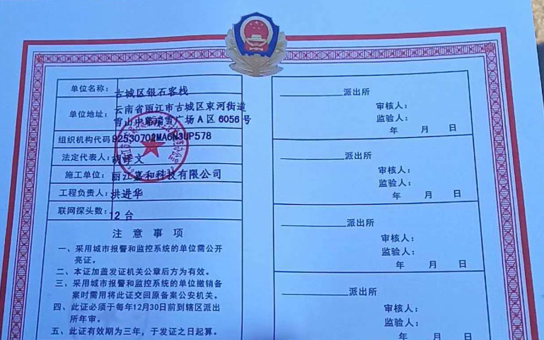 關(guān)于古城區(qū)納云歸舍民宿店(個(gè)體工商戶)電子監(jiān)控安防合格證下證通知