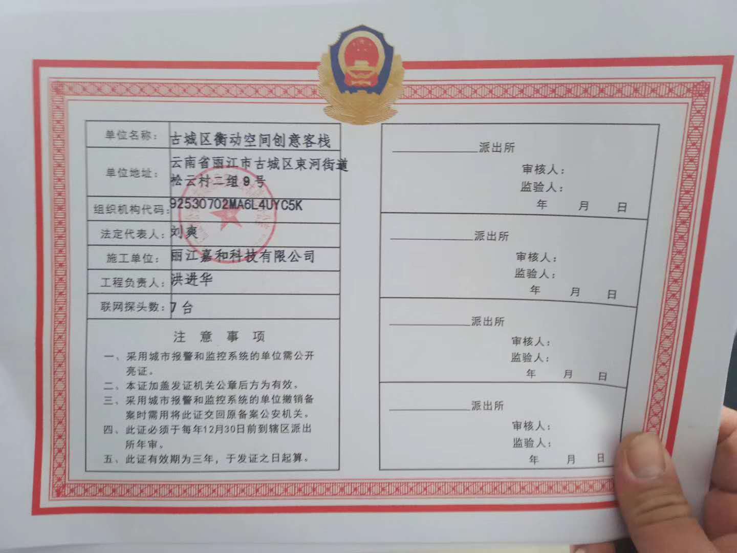 關于古城區(qū)納云歸舍民宿店(個體工商戶)電子監(jiān)控安防合格證下證通知