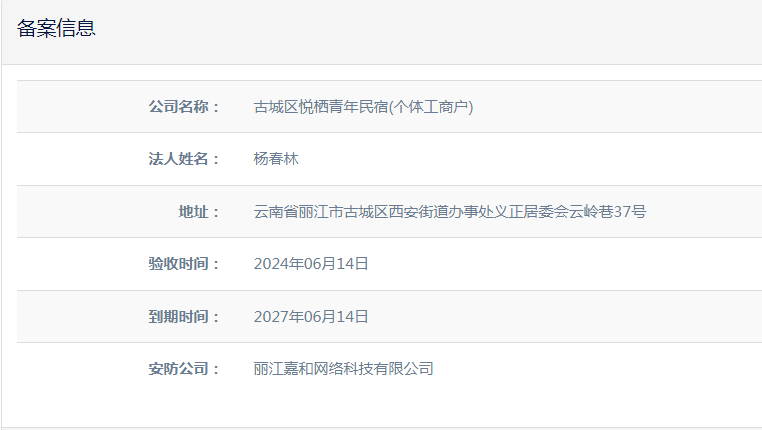關于古城區(qū)悅棲青年民宿(個體工商戶)電子監(jiān)控安防合格證下證通知