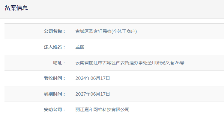 關于古城區(qū)盈客軒民宿(個體工商戶)電子監(jiān)控安防合格證下證通知