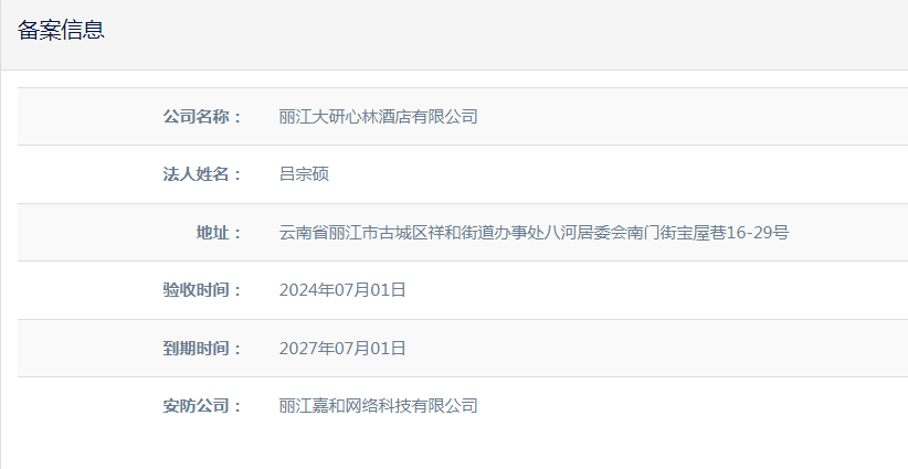 關(guān)于麗江大研心林酒店有限公司電子監(jiān)控安防合格證下證通知