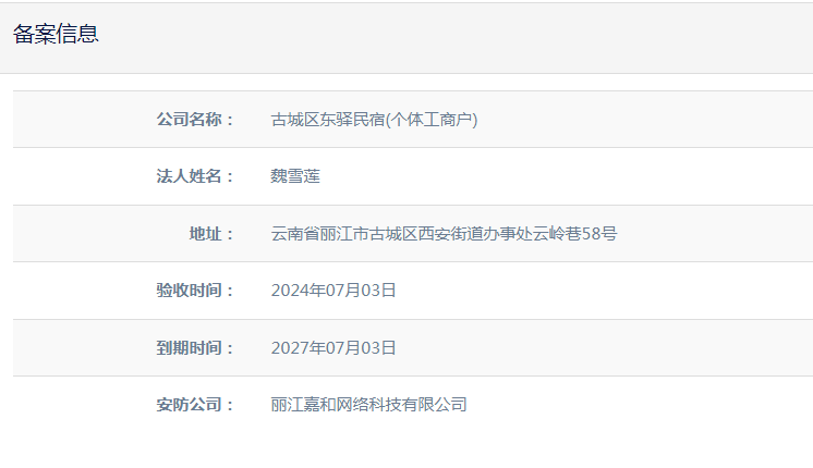關(guān)于古城區(qū)納云歸舍民宿店(個(gè)體工商戶)電子監(jiān)控安防合格證下證通知