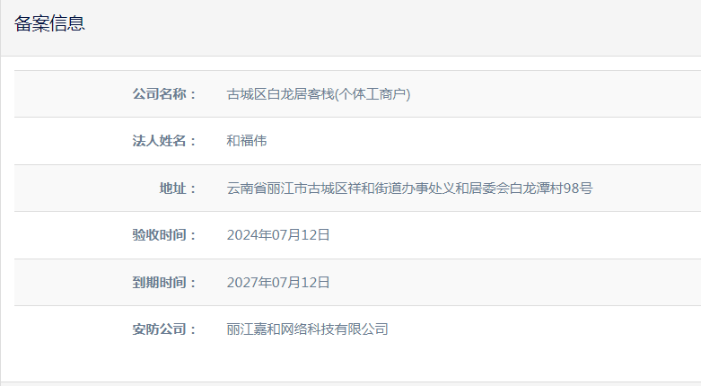 關(guān)于古城區(qū)白龍居客棧(個(gè)體工商戶(hù))電子監(jiān)控安防合格證下證通知