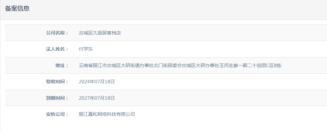 關(guān)于古城區(qū)納云歸舍民宿店(個(gè)體工商戶)電子監(jiān)控安防合格證下證通知