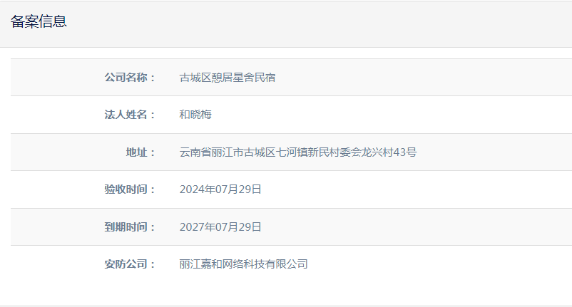 關(guān)于古城區(qū)納云歸舍民宿店(個(gè)體工商戶)電子監(jiān)控安防合格證下證通知