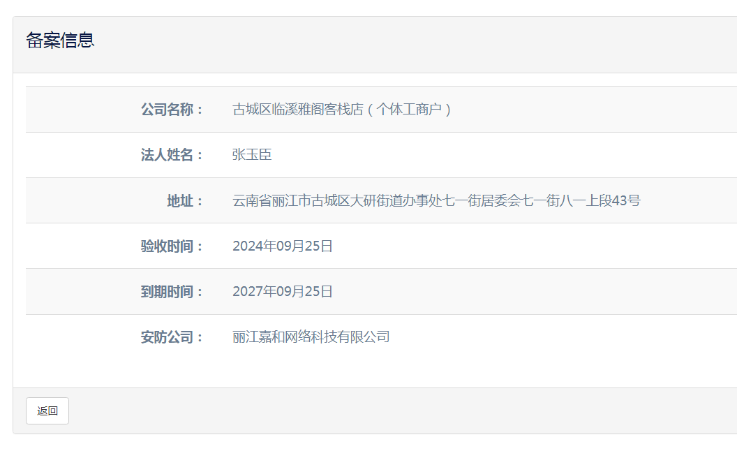關(guān)于古城區(qū)納云歸舍民宿店(個體工商戶)電子監(jiān)控安防合格證下證通知
