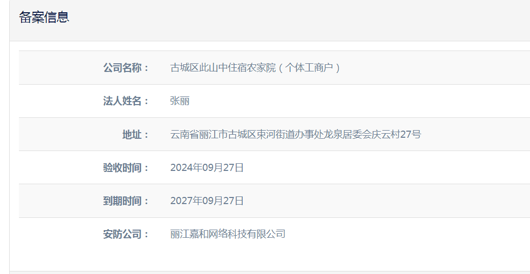 關(guān)于古城區(qū)納云歸舍民宿店(個(gè)體工商戶)電子監(jiān)控安防合格證下證通知