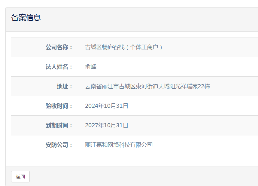 關(guān)于古城區(qū)納云歸舍民宿店(個(gè)體工商戶)電子監(jiān)控安防合格證下證通知