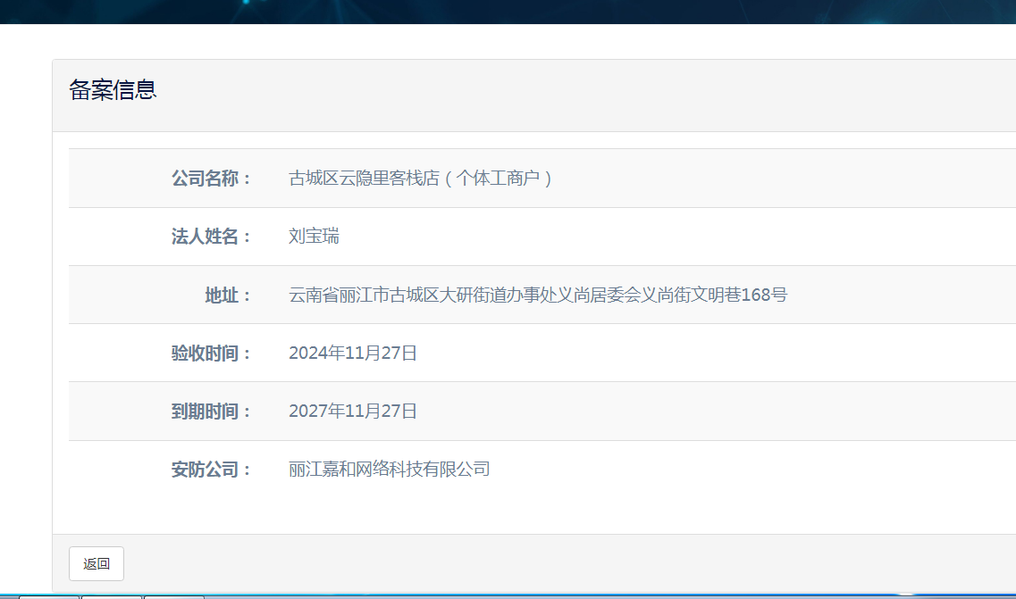 關(guān)于古城區(qū)納云歸舍民宿店(個(gè)體工商戶)電子監(jiān)控安防合格證下證通知