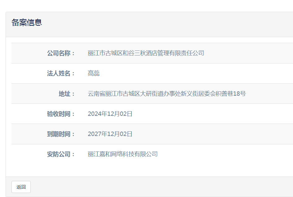 關(guān)于麗江市古城區(qū)和谷三秋酒店管理有限責(zé)任公司電子監(jiān)控安防合格證下證通知