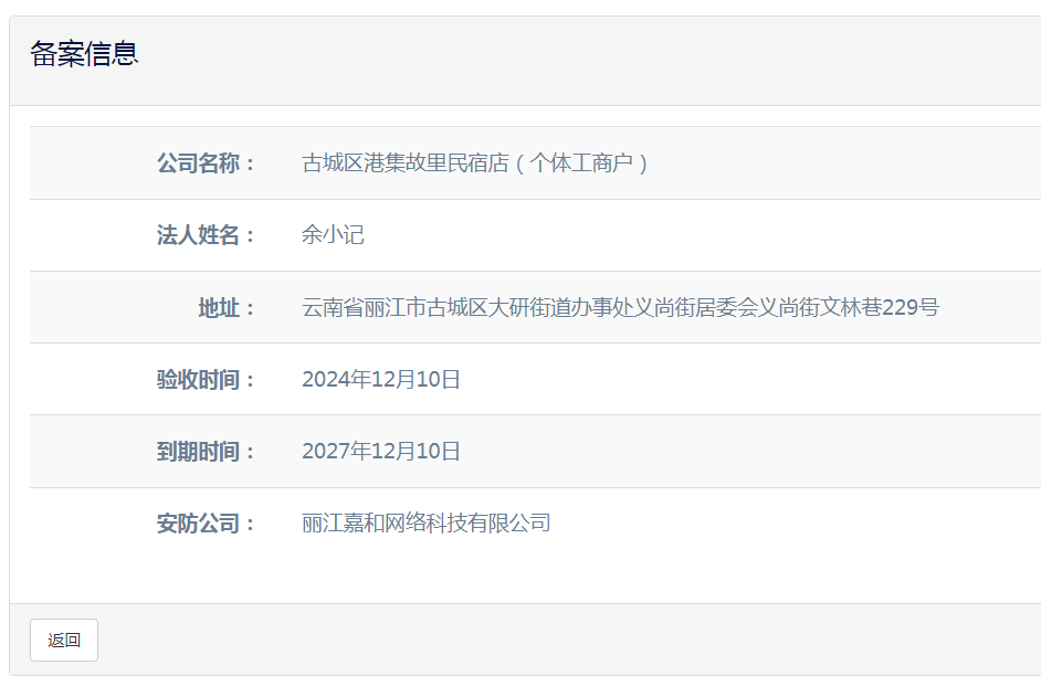 關(guān)于古城區(qū)納云歸舍民宿店(個體工商戶)電子監(jiān)控安防合格證下證通知