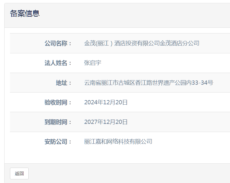 關(guān)于金茂(麗江)酒店投資有限公司金茂酒店分公司電子監(jiān)控安防合格證下證通知