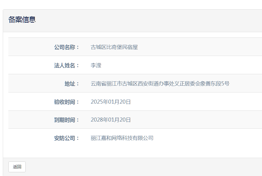 關(guān)于古城區(qū)納云歸舍民宿店(個體工商戶)電子監(jiān)控安防合格證下證通知