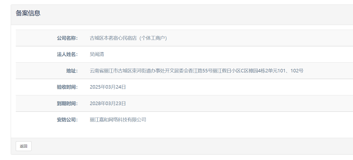 關(guān)于古城區(qū)納云歸舍民宿店(個體工商戶)電子監(jiān)控安防合格證下證通知