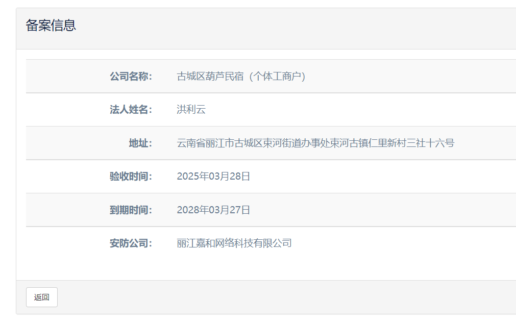 關于古城區(qū)納云歸舍民宿店(個體工商戶)電子監(jiān)控安防合格證下證通知