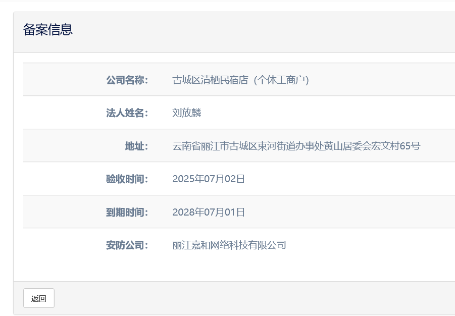 關(guān)于古城區(qū)納云歸舍民宿店(個(gè)體工商戶)電子監(jiān)控安防合格證下證通知