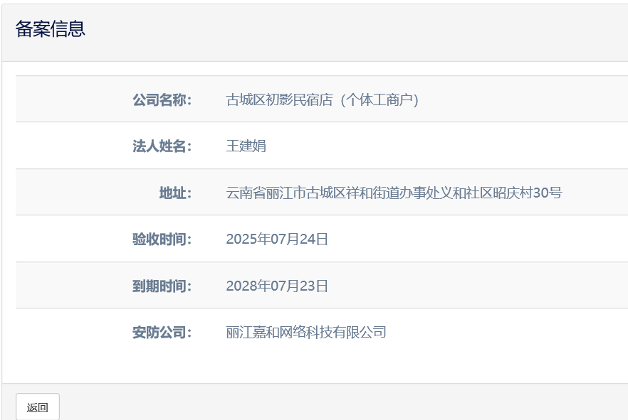 關(guān)于古城區(qū)納云歸舍民宿店(個(gè)體工商戶)電子監(jiān)控安防合格證下證通知