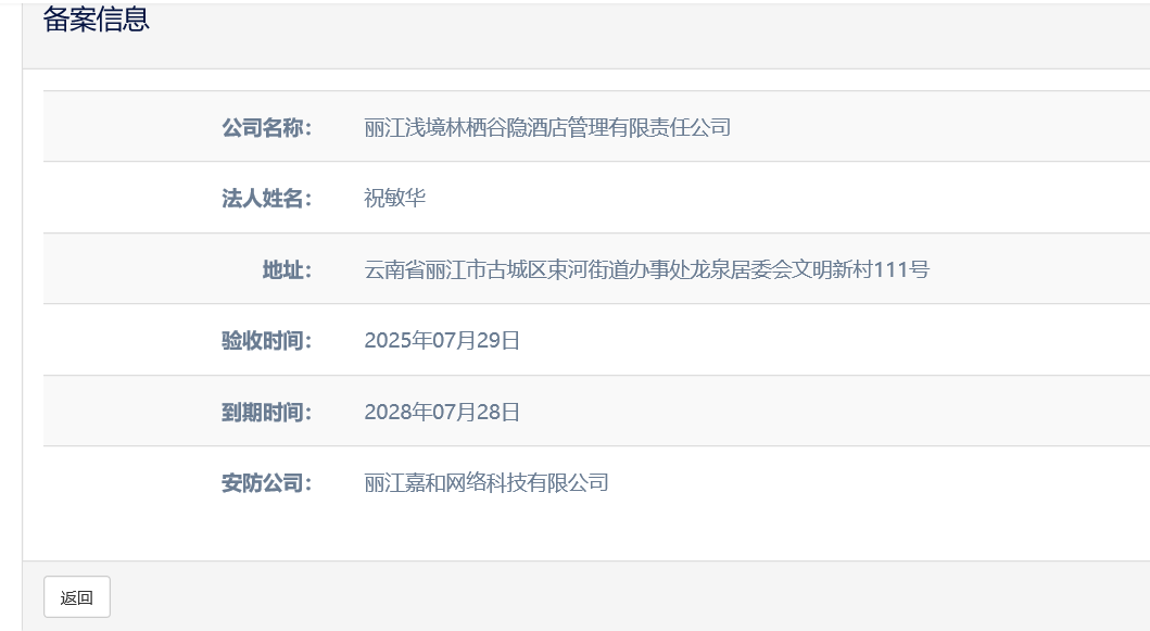 關于麗江淺境林棲谷隱酒店管理有限責任公司電子監(jiān)控安防合格證下證通知