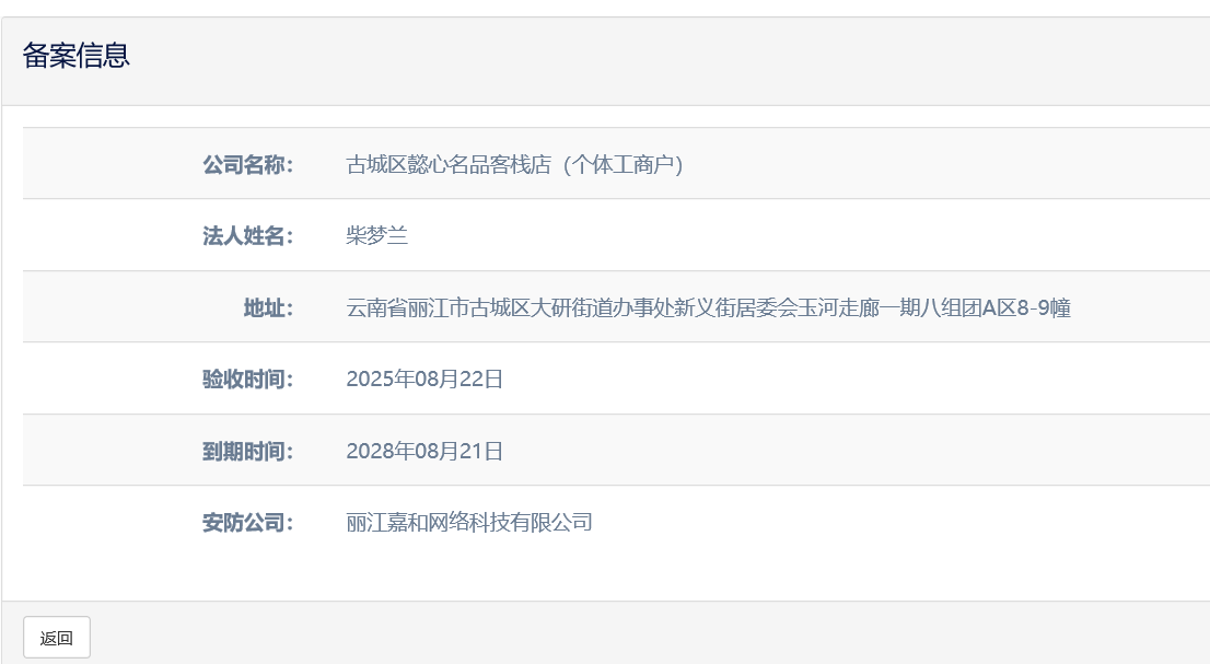 關(guān)于古城區(qū)納云歸舍民宿店(個體工商戶)電子監(jiān)控安防合格證下證通知