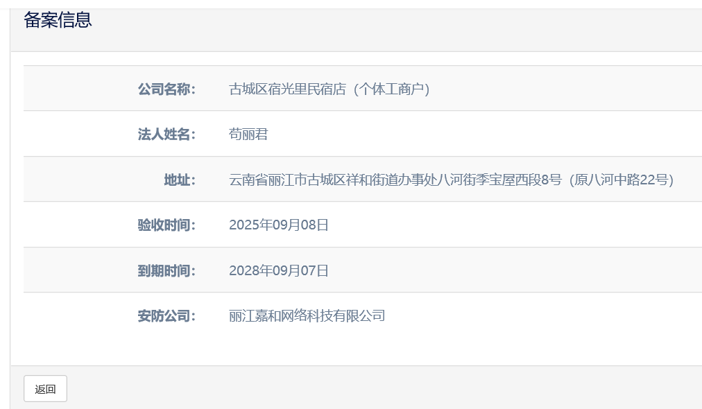 關(guān)于古城區(qū)納云歸舍民宿店(個體工商戶)電子監(jiān)控安防合格證下證通知