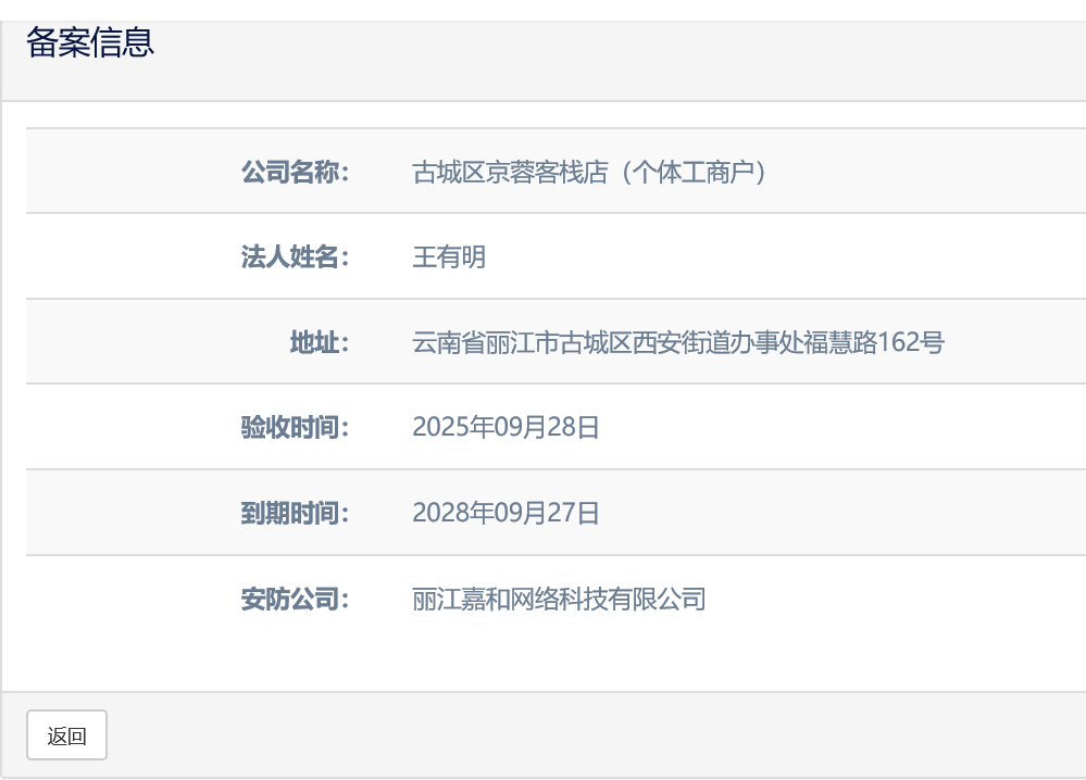 關于古城區(qū)納云歸舍民宿店(個體工商戶)電子監(jiān)控安防合格證下證通知