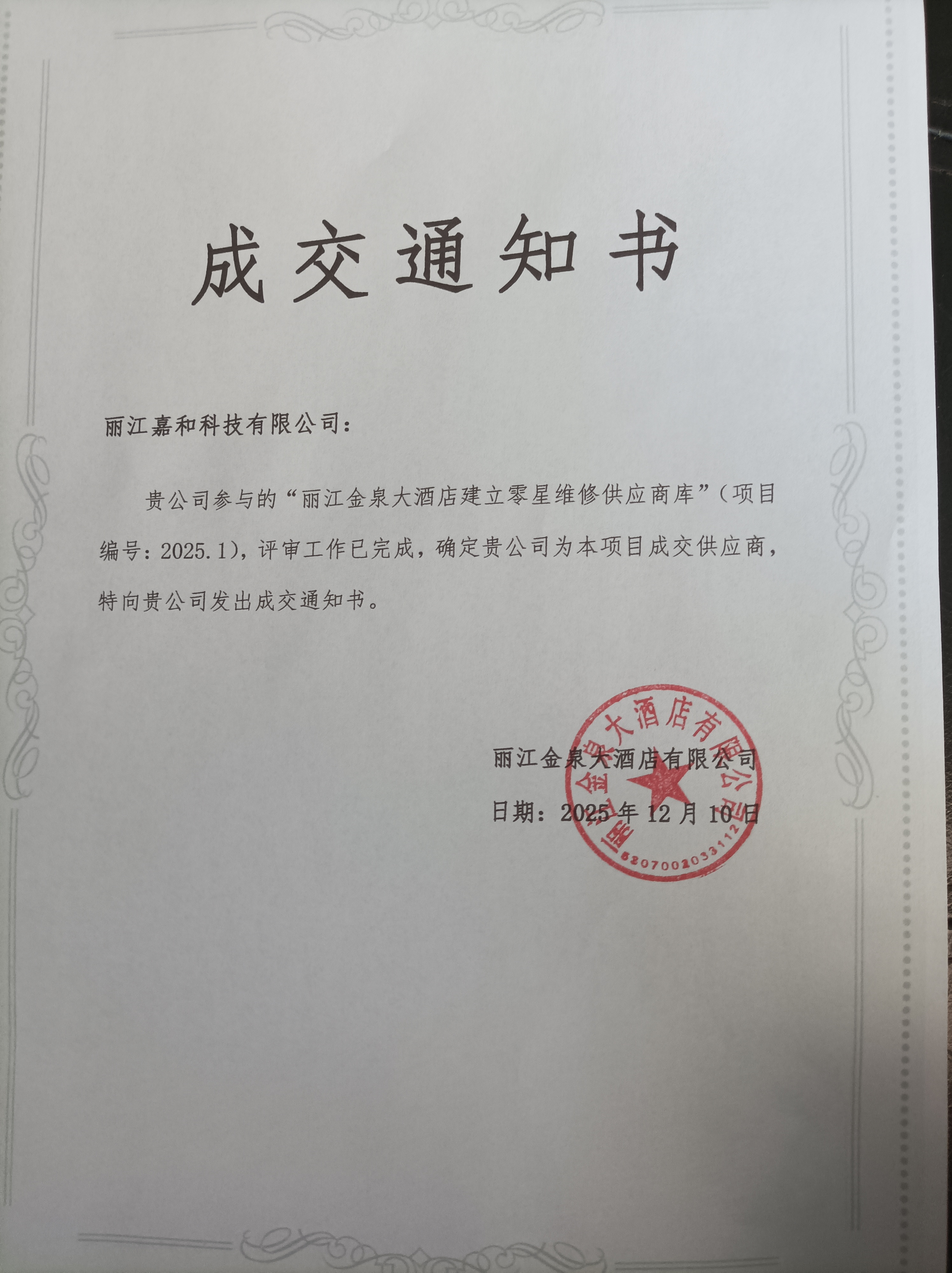 熱烈慶祝我司入圍麗江金泉大酒店供應(yīng)商