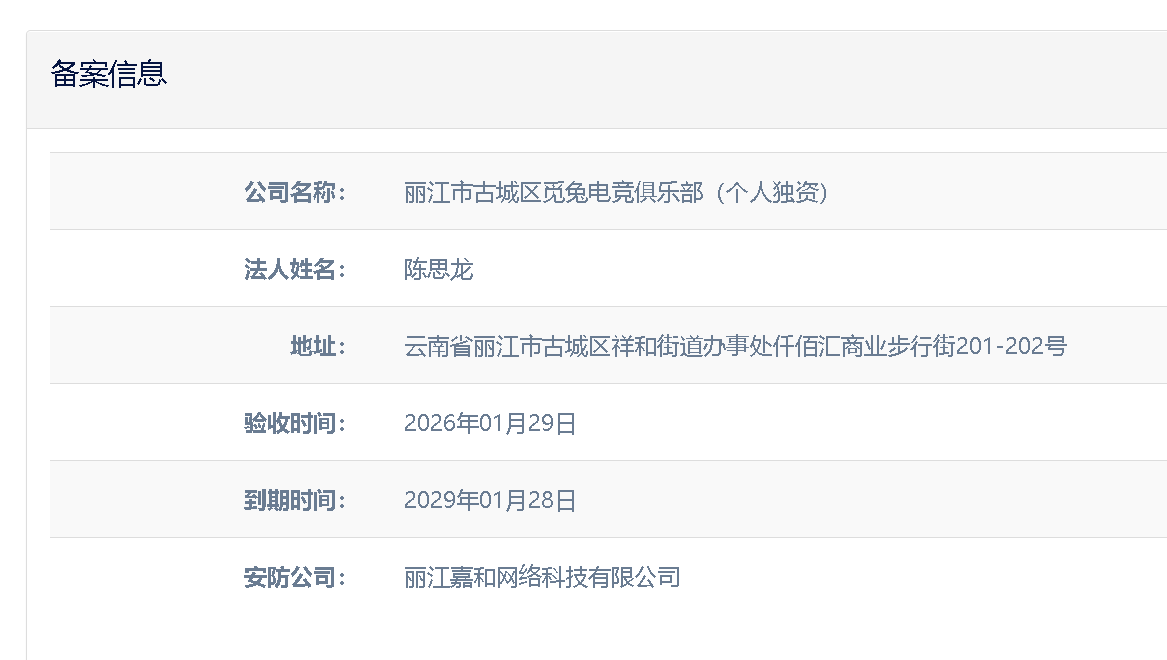 關(guān)于麗江市古城區(qū)覓兔電競(jìng)俱樂(lè)部(個(gè)人獨(dú)資)電子監(jiān)控安防合格證下證通知