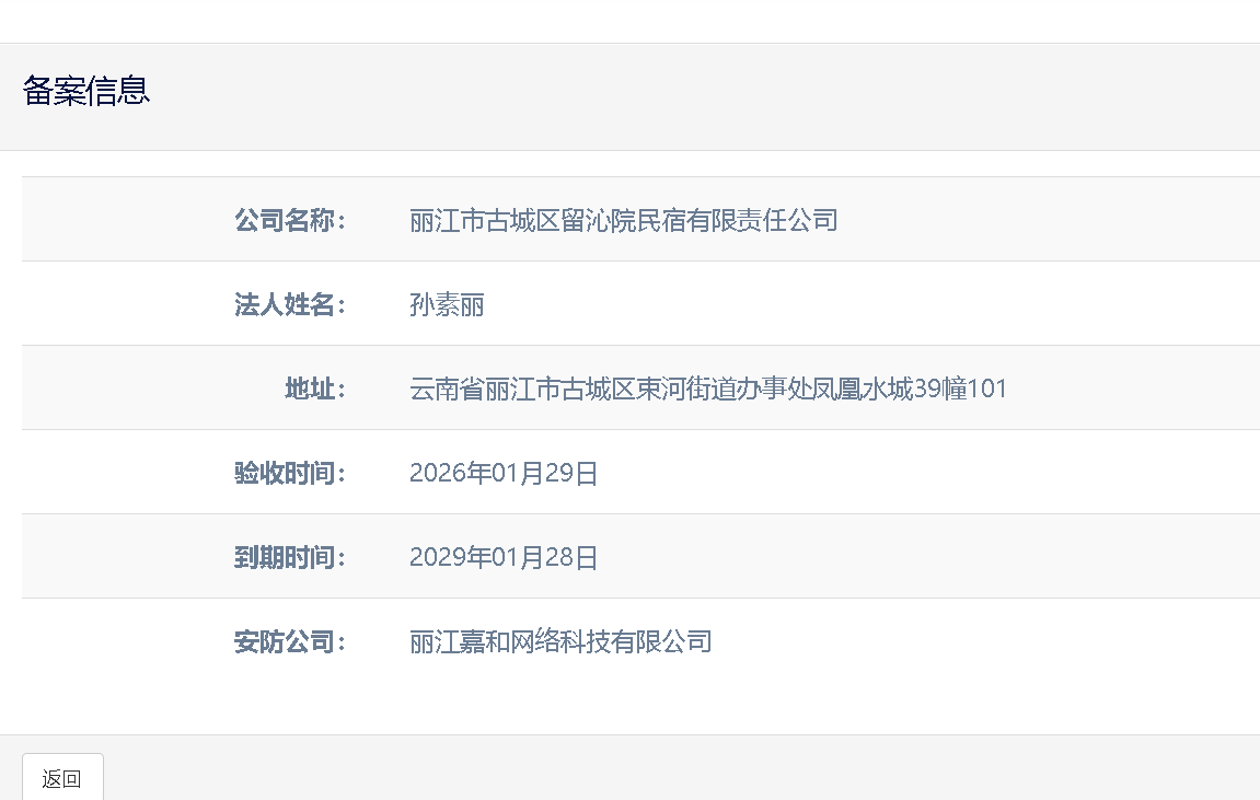 關(guān)于麗江市古城區(qū)留沁院民宿有限責(zé)任公司電子監(jiān)控安防合格證下證通知